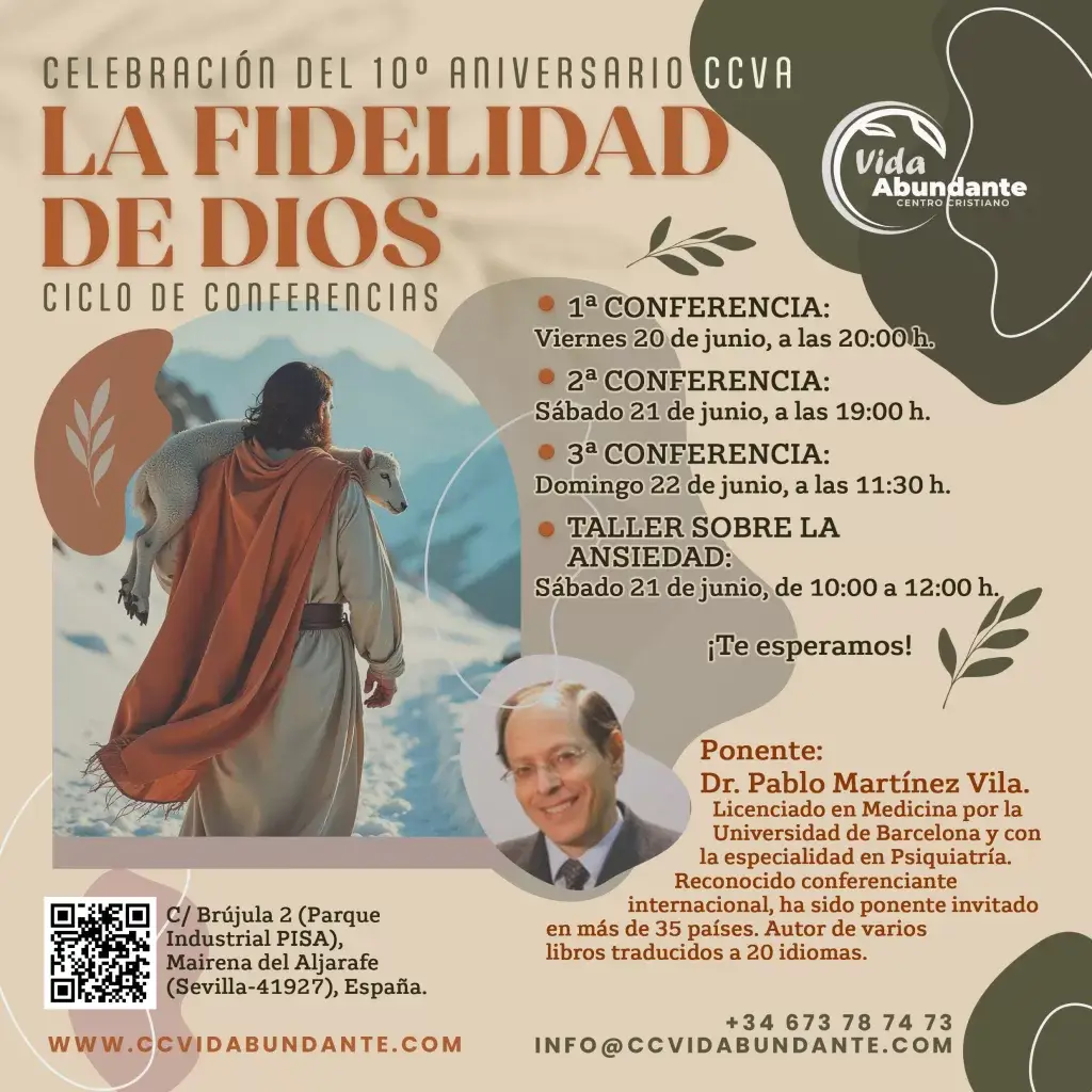 Estimados hermanos y amigos del Centro Cristiano Vida Abundante (CCVA), es con gran gozo que les invitamos a ser parte de una celebración especial por nuestro décimo aniversario. Tres días de profundas conferencias y un taller sobre la ansiedad, bajo el lema «La fidelidad de Dios», para seguir creciendo juntos en Su gracia y poder transformador.